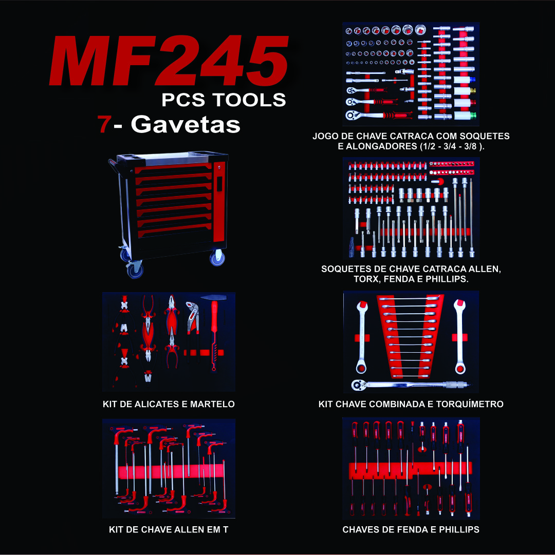 Carrinho de ferramentas completo, desenvolvido para uso profissional em oficinas mecânicas, centros automotivos, borracharias e manutenção industrial. Possui estrutura metálica resistente, gavetas organizadas e um conjunto amplo de ferramentas que atende desde serviços leves até aplicações pesadas.